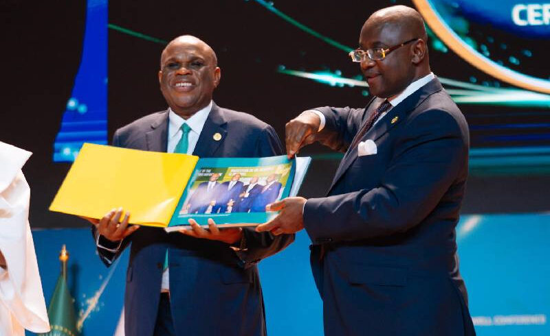 Incoming Afreximbank President Dr George Elombi (right) presents a commemorative coffee table book to his predecessor, Professor Benedict Oramah, during the bank’s farewell and investiture ceremony. [Brian Ngugi, Standard]