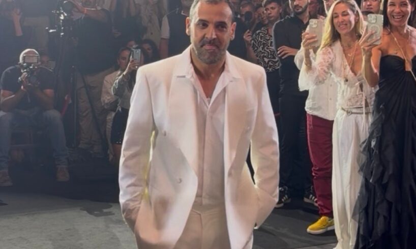 The crowd erupted in cheers as Sharabi — decked out in a white suit — appeared among the models.