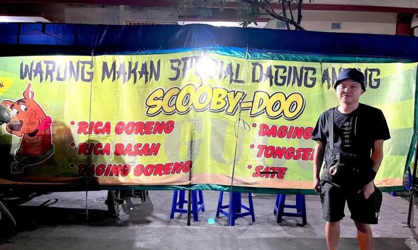 In Solo in Central Java province, a roadside stall displays a large banner claiming to specialise in “Scooby-Doo” dishes, featuring the cartoon dog with his tongue out. The stall offers fried dog meat, dog meat satay, spicy dog meat and dog meat stew.