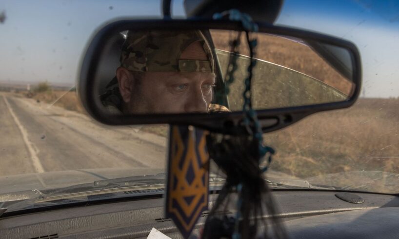 A Ukrainian soldier of the 65th Mechanized Brigade drives a car on a road near the frontline village of Robotyne, in the Zaporizhzhia region, on Oct. 1, 2023, amid the Russian invasion of Ukraine. (Roman Pilipey/AFP via Getty Images)