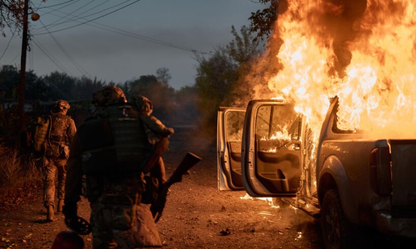Ukrainian soldiers walk past a vehicle recently struck by a Russian FPV kamikaze drone near Kostiantynivka, Donetsk Oblast, Ukraine, on Oct. 16, 2025. (Kostiantyn Liberov / Libkos / Getty Images)