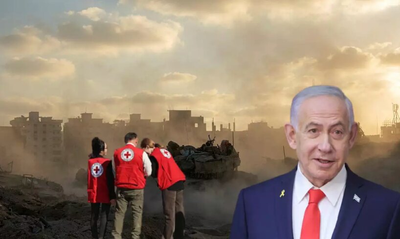 Netanyahu and Red Cross officials against the backdrop of Gaza (REUTERS/Ramadan Abed; IDF; Marc Israel Sellem) Marc Israel Sellem;