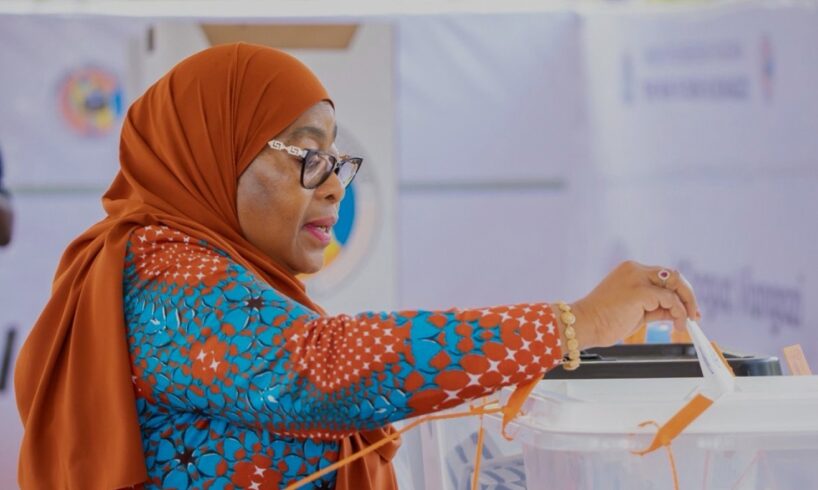 Tanzanian President Samia Suluhu Hassan casts her vote at a polling station in Dodoma, Tanzania, on Wednesday.