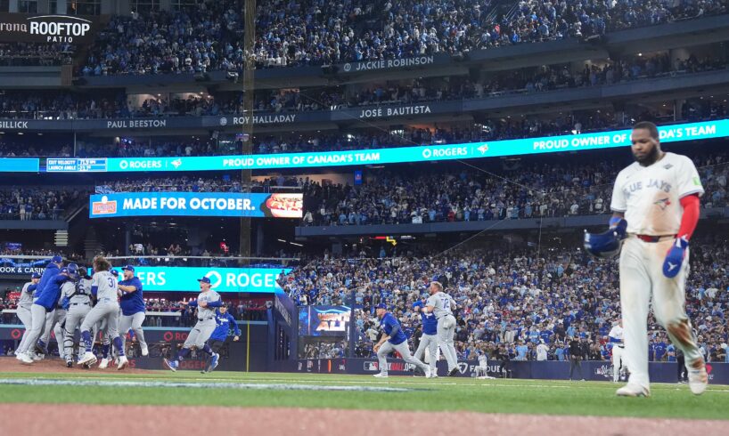 The Los Angeles Dodgers celebrate as Toronto Blue Jays’ Vladimir Guerrero Jr. walks off the field after the Dodgers won Game 7 of the World Series in Toronto on Saturday.Nathan Denette/The Canadian Press