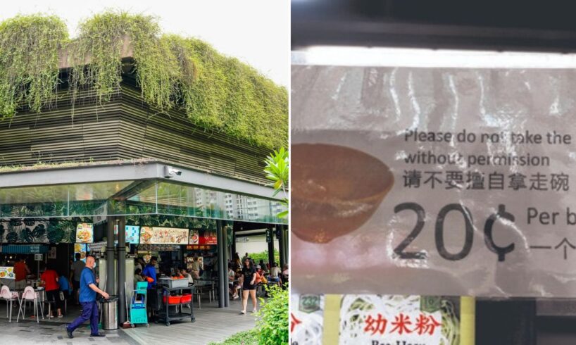 Several hawkers at Bukit Canberra Hawker Centre have posted notices stating that customers must pay S$0.20 for using extra bowls and plates, drawing public attention.