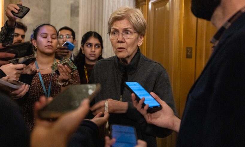 Sen. Elizabeth Warren (D-MA) speaks to reporters following a vote on Capitol Hill on Nov. 9, 2025, in Washington, D.C. The Senate convened for a rare Sunday session in an attempt to end the government shutdown.