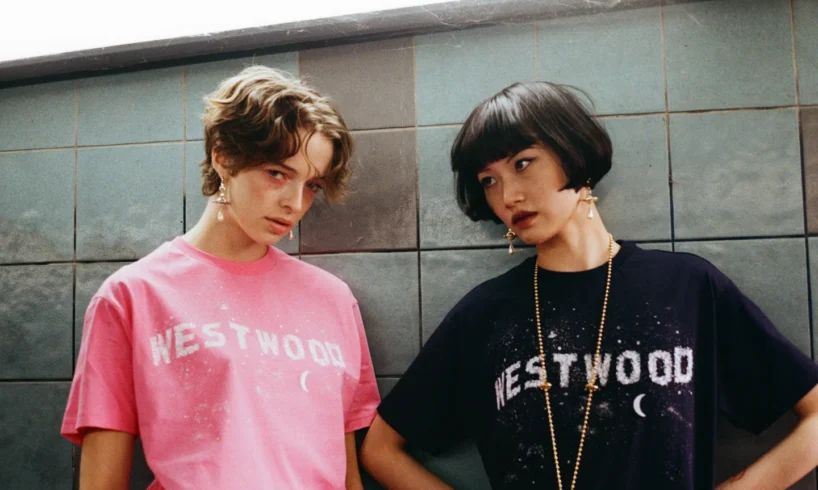The collection also re-introduces the “Mini Sunday Dress” in a light pink poplin reminiscent of Nana Komatsu’s outfits. You can also spot the fine-knit “Bea Corset Cardi” in a fluorescent pink, and simple T-shirts in deep navy and hot pink, featuring a “Westwood Galaxy” print.