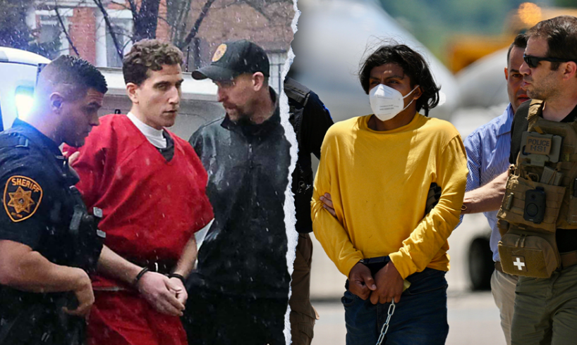 Bryan Kohberger, on the left, is escorted to his extradition hearing in Pennsylvania after his arrest in the University of Idaho student murders case. On the right, illegal immigrant Victor Martinez-Hernandez after his arrest in connection with the rape and murder of Maryland mom Rachel Morin. (The Image Direct for Fox News Digital, Jerry Jackson/The Baltimore Sun/Tribune News Service via Getty Images)