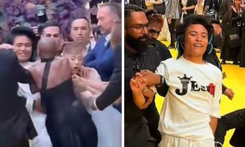 As Wen was being escorted out, he suddenly turned back and ran towards the yellow carpet and made a second attempt to jump over the barricade.