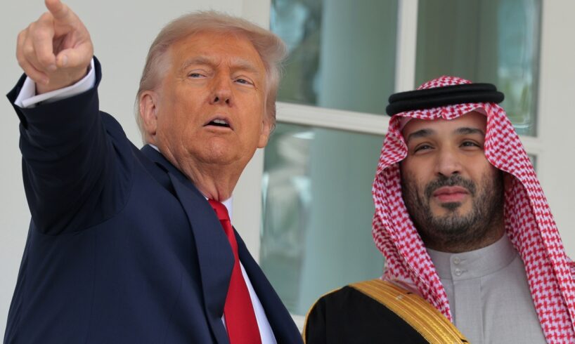President Trump (L) gives Crown Prince and Prime Minister Mohammed bin Salman of Saudi Arabia a tour of the White House on Nov. 18, 2025, in Washington, D.C. The two leaders held meetings aimed at strengthening economic and defense ties, including the sale of F-35 fighter jets to Saudi Arabia.
