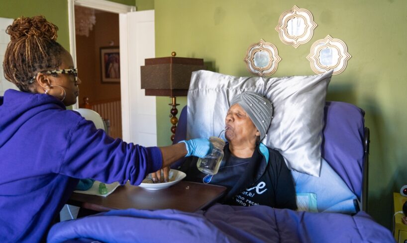 Dawnita Brown gives her mother, Joan Cain, water to help swallow pills after breakfast. Brown is the primary caregiver to her mother and father, who live with her in Baltimore.