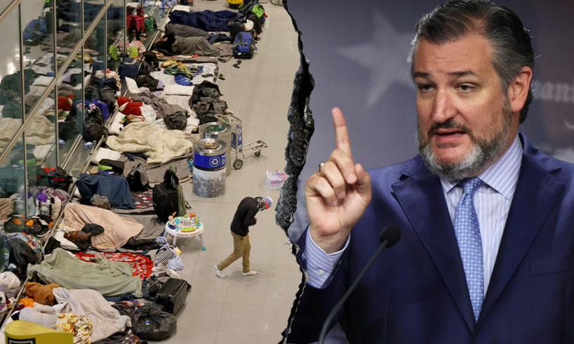 This split shows migrants at Boston Logan International Airport and Sen. Ted Cruz, R-Texas. (Getty)