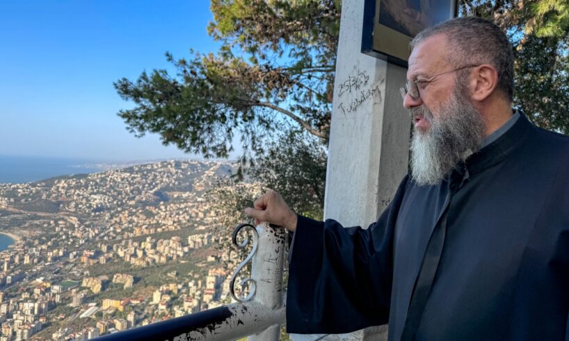 Father Fadi el-Mir looks out to the Mediterranean from Our Lady of Lebanon sanctuary. Pope Leo will meet there with clergy and other church officials.
