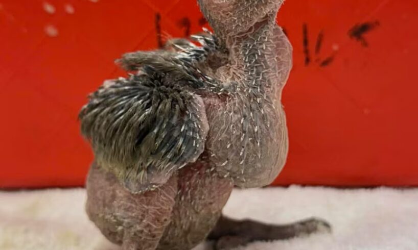 A galah chick stands on a towel after being rescued near Mudgee. (Supplied: WIRES)