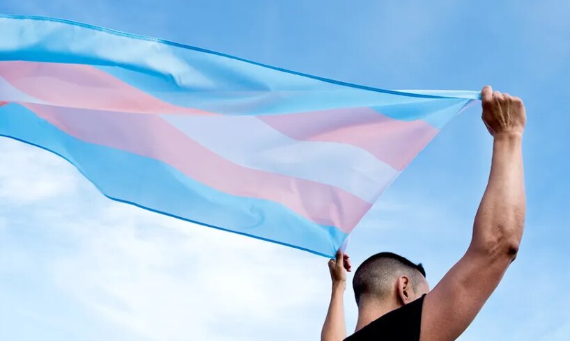 Demonstrators display a “Protect Trans Rights” flag during a protest. (Andrea Ronchini/NurPhoto via Getty Images)