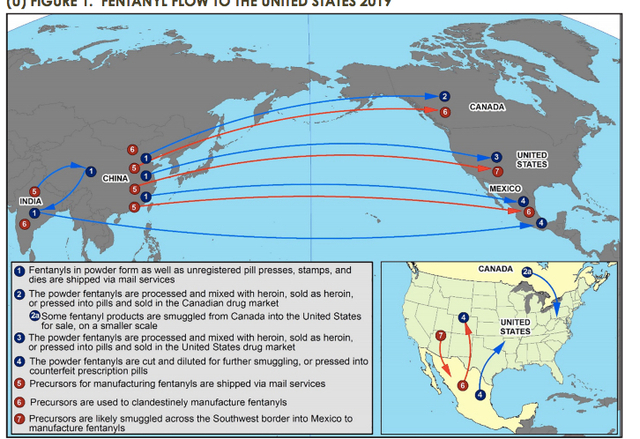 “Illicit fentanyl, primarily manufactured in foreign clandestine labs and smuggled into the United States through Mexico, is being distributed across the country and sold on the illegal drug market,” the DEA writes on its web site.