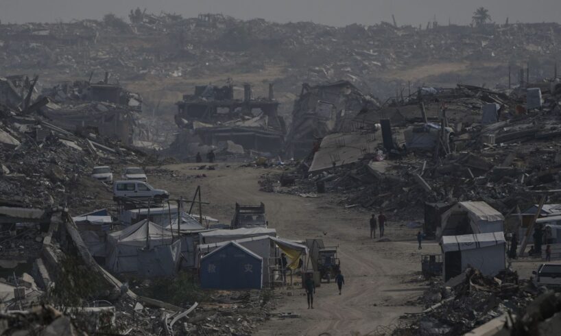 Palestinians walk through the destruction left by the Israeli air and ground offensive in Gaza City, Friday, Dec. 5, 2025. [AP Photo/Abdel Kareem Hana]