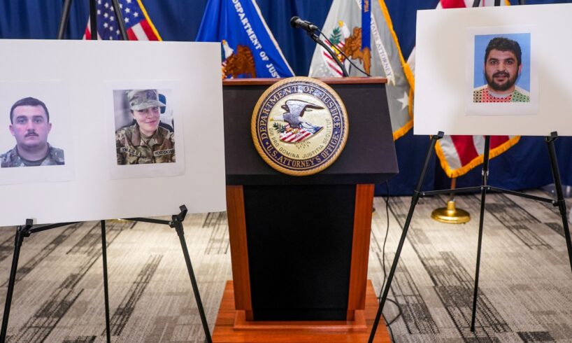 Pictures of National Guard members Andrew Wolfe and Sarah Beckstrom, who were shot on Nov. 26 in Washington, D.C., are displayed next to a picture of the suspect in the shooting, Afghan national Rahmanullah Lakanwal, on the day of a news conference in Washington, D.C., on Nov. 27.
