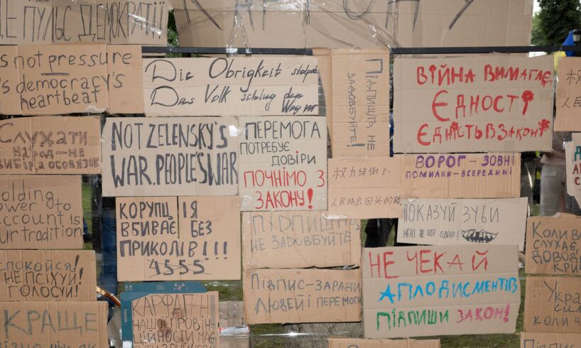 A collection of placards are displayed during an anti-corruption demonstration in Kyiv, Ukraine, on July 31, 2025. (Mykhaylo Palinchak/SOPA Images/LightRocket via Getty Images)