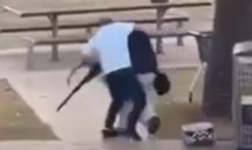 A bystander can be heard “f*****g bash him” before a shirtless man approaches and kicks the man on the ground, before police move him away.