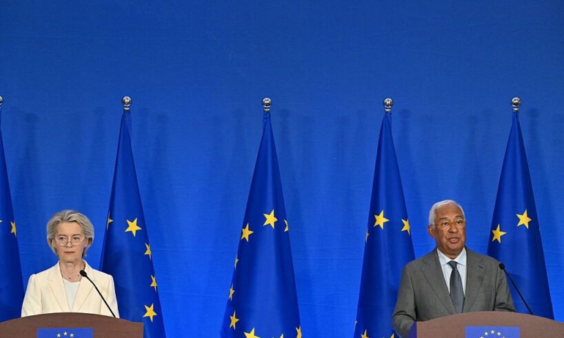 European Commission President Ursula von der Leyen (L) and European Council President Antonio Costa attend a joint press conference after the 25th EU-China summit in Beijing on July 24, 2025. (Adek Berry/AFP via Getty Images)