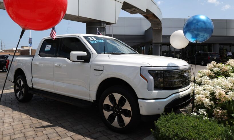NILES, ILLINOIS – JULY 18: A 2023 Ford F-150 Lightning EV is offered for sale at Golf Mill Ford on July 18, 2023 in Niles, Illinois.