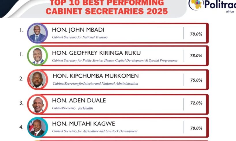 The 2025 Politrack Africa Performance Survey ranks National Treasury CS John Mbadi and Public Service CS Geoffrey Ruku jointly at the top with an approval rating of 78 per cent. They are closely followed by Interior and National Administration CS Kipchumba Murkomen, who scored 75 per cent.