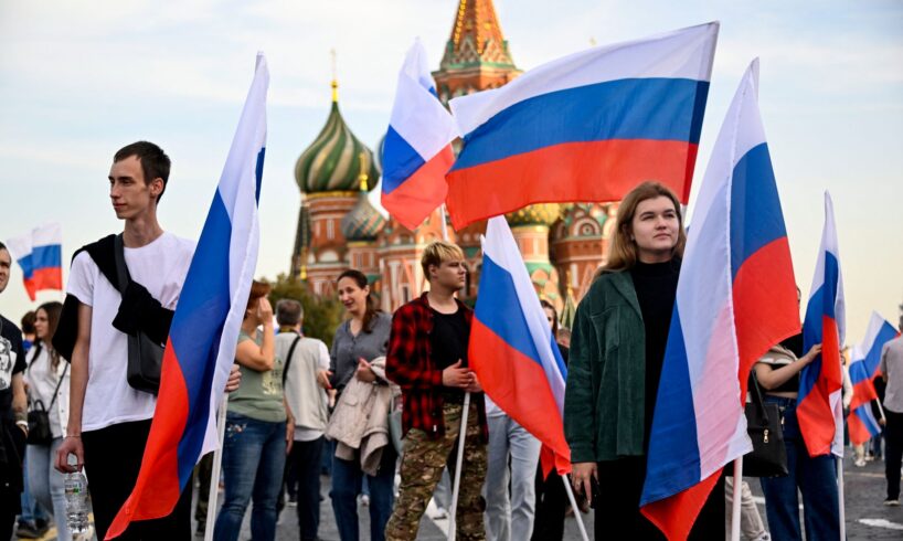 People celebrate the first anniversary of Russia’s annexation of four Ukrainian Oblasts at Red Square in Moscow, Russia, on Sept. 29, 2023. (Alexander Nemenov / AFP / Getty Images)
