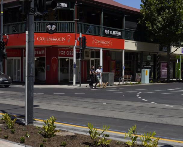 Glenelg’s Jetty Road was closed to traffic for months and re-opened Friday. (ABC News: Ashlin Blieschke)