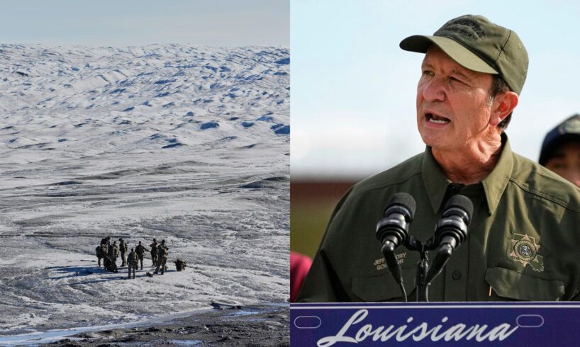 Left, Danish military forces participate in an exercise with troops from several European NATO members in Kangerlussuaq, Greenland, Wednesday, September 17, 2025; Right, Louisiana Governor Jeff Landry speaks to reporters at the Louisiana State Penitentiary in Angola, Louisiana, September 3, 2025. [AP Photo/Ebrahim Noroozi/Gerald Herbert]