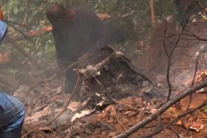In this image taken from video, people work at the site of a military helicopter crash in Adansi, Ghana, on August 6, 2025. HAFIZ TIJANI / AP Ghana’s defense and environment ministers...
