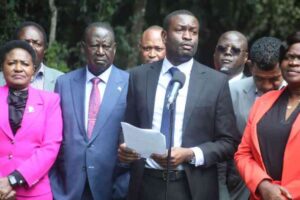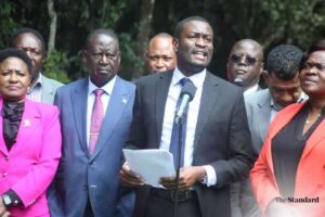 ODM officials, including Party Leader Raila Odinga, Secretary General Edwin Sifuna and Chairperson Gladys Wanga, address a press conference in Nairobi on July 29. [Collins Oduor, Standard]