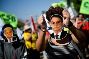A demonstrator, wearing a mask depicting Brazilian former President Jair Bolsonaro, gestures in handcuffs during a protest against US President Donald Trump’s tariffs on Brazilian products, in front of the United States... Read more »