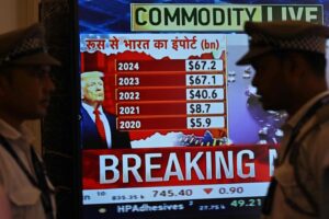 A broadcast screen of the Bombay Stock Exchange is pictured in Mumbai on July 31, 2025, which shows India’s exports with Russia while depicting news of US President Donald Trump unveiling sweeping... Read more »