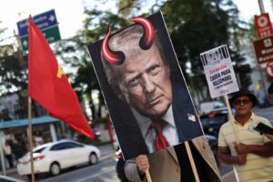 A demonstrator holds an image of US President Donald Trump with red horns during a protest against the tariffs on Brazilian products imposed by Trump, in São José dos Campos, Brazil, July... Read more »