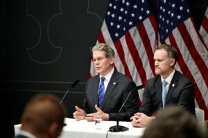 US Treasury Secretary Scott Bessent speaks next to US Trade Representative Jamieson Greer during a press conference at government quarters Rosenbad after the trade talks between the US and China concluded, in... Read more »