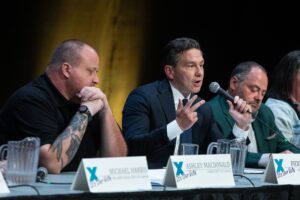 Open this photo in gallery: Conservative Party candidate Pierre Poilievre speaks as Green Party candidate Ashley MacDonald, left, and Liberal Party candidate Darcy Spady, right, listen during the Battle River—Crowfoot by-election candidate... Read more »