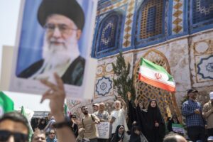 Demonstrators wave Iranian flags as one holds up a poster of Iran’s Supreme Leader Ayatollah Ali Khamenei during a protest against Israeli attacks on Iran, after the Friday prayer ceremonies on June... Read more »