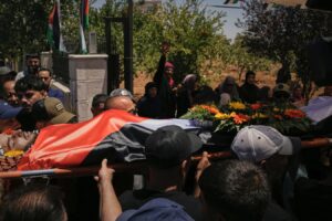 Mourners carry the body of Palestinian-American Sayfollah Musallet, 20, during his funeral in the West Bank village of Al-Mazraa a-Sharqiya on Sunday, July 13, 2025. Musallet was murdered by Israeli settlers. [AP... Read more »