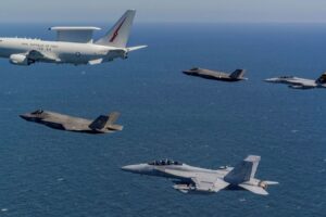 Royal Air Force and United States Marine Corps F-35B Lightning IIs and EA-18G Growler, E-7A Wedgetail fly over the Northern Territory airspace during Exercise Talisman Sabre 2025. [Photo: defence.gov.au/photo David Gibbs] Massive... Read more »