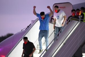 A Venezuelan migrant who was jailed in El Salvador gestures as he gets off a plane at Simon Bolívar International Airport in Maiquetía, Venezuela on Friday. El Salvador freed scores of Venezuelans... Read more »